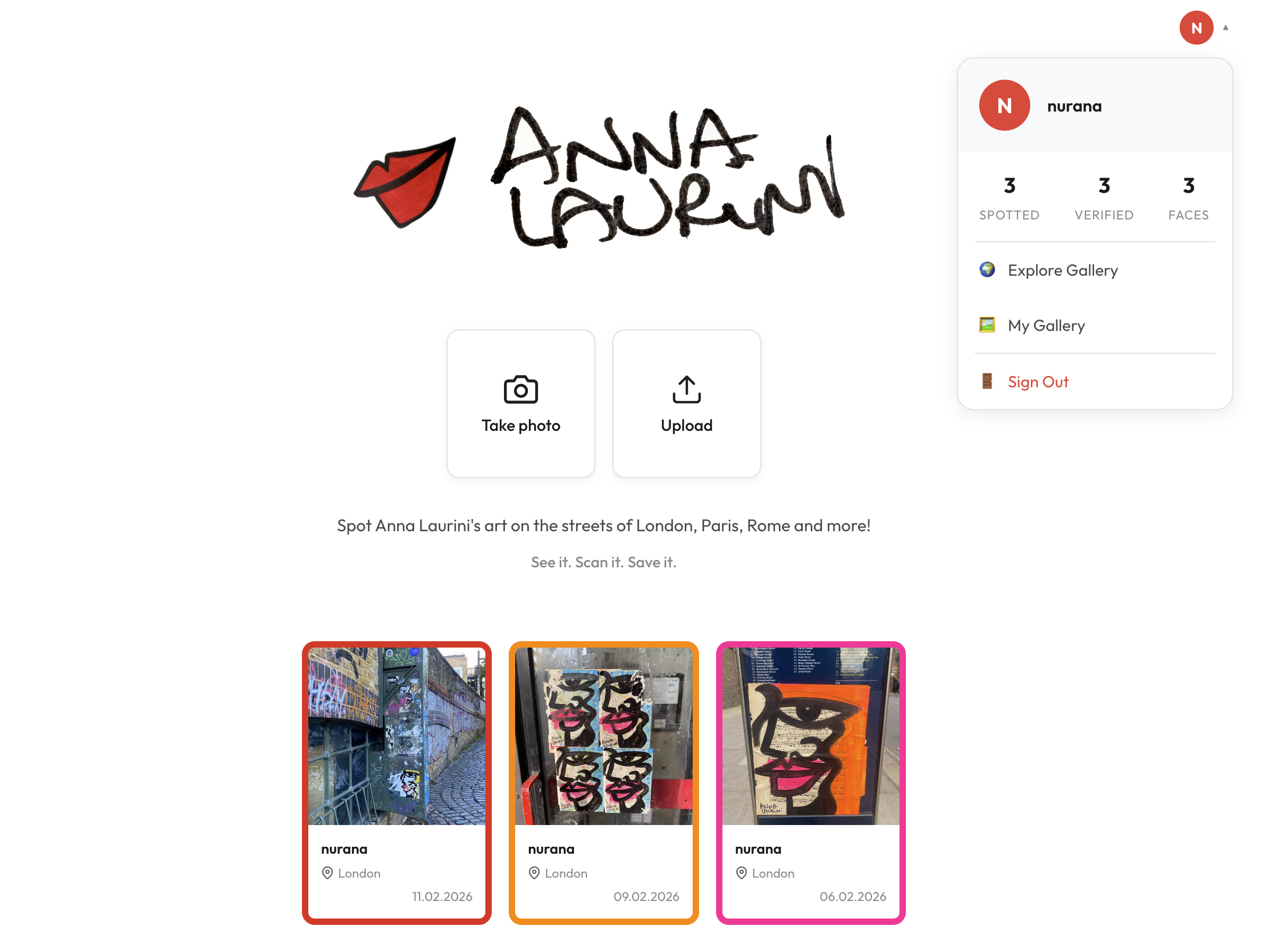 “Spot the Artist” is a web app where users in London, Paris and other cities photograph and share street art by Anna Laurini. That helps to create a shared digital gallery, preserve the art and to grow the community.